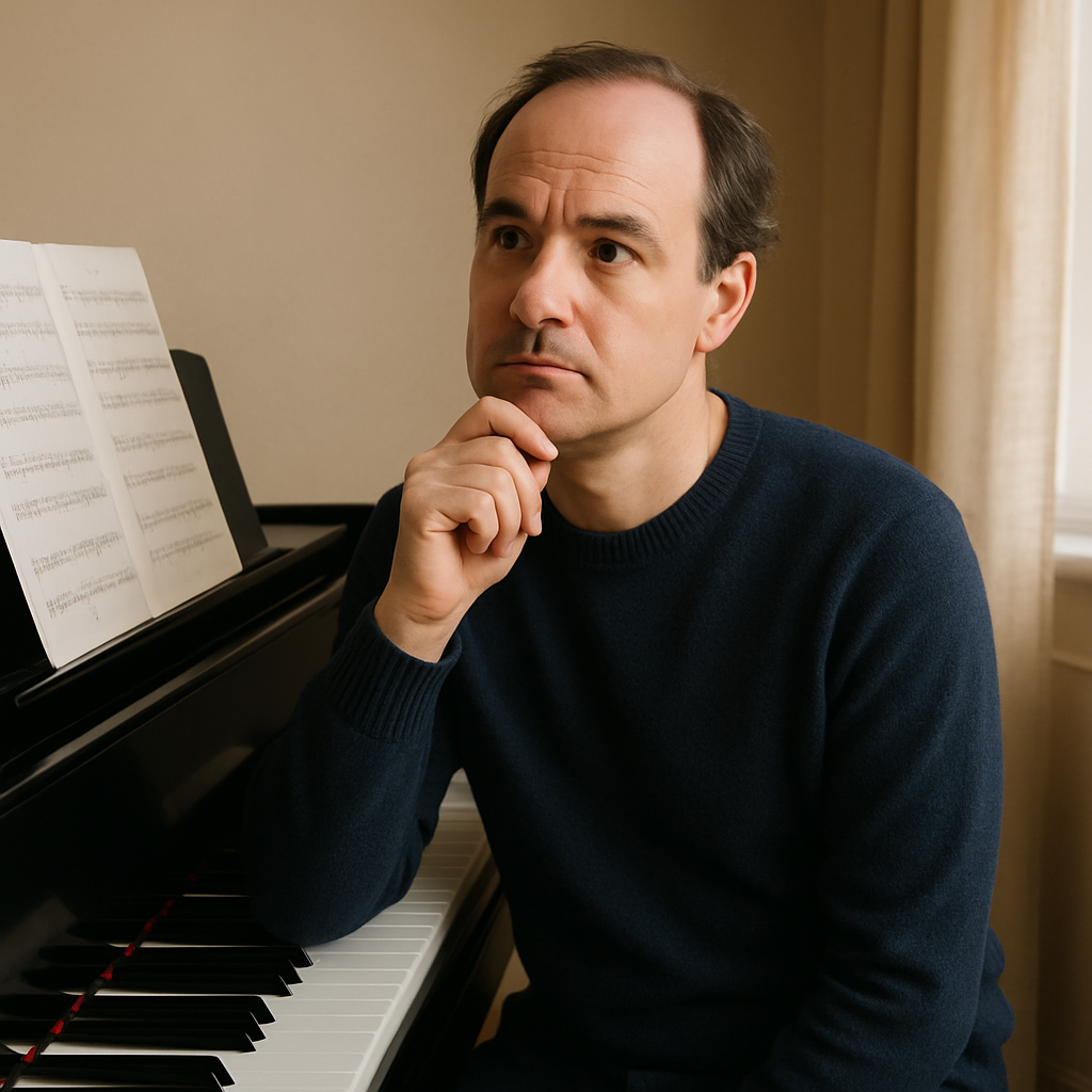 A middle-aged man in a navy sweater sits at a piano, looking thoughtfully upward with a slightly raised eyebrow, conveying curiosity and doubt rather than sadness, in a softly lit, calm room.